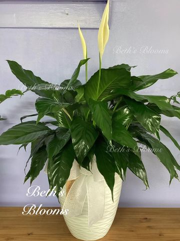 Large dark green peace lily with white blooms. Comes dressed in a decorative pot with a bow. Approximately 30” tall and 24” across. This plant is toxic to dogs and cats.