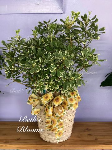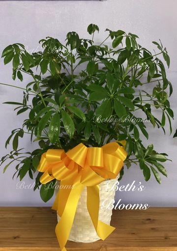 Dark green schefflera dressed in a basket with a bow. Does well in a sunny window or outdoors. Approximately 30” tall and 24” across.