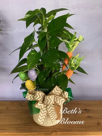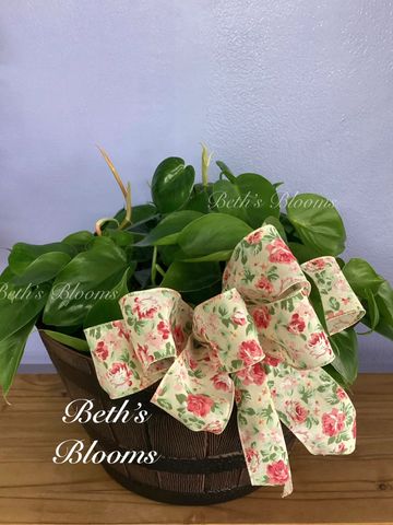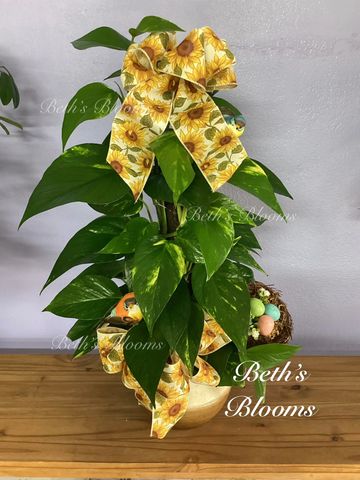 Small dark green or Variegated Pothos Ivy. Dressed in a basket with a bow. Pothos Ivy are toxic to dogs and cats.