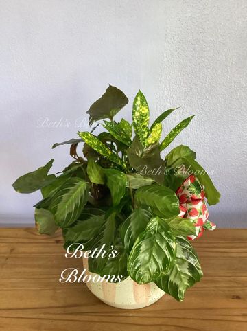 Mixture variety plant ceramic dish. Variegated croton, green prayer plant, and arrowhead plant. Approximately 10” tall and 10” across.